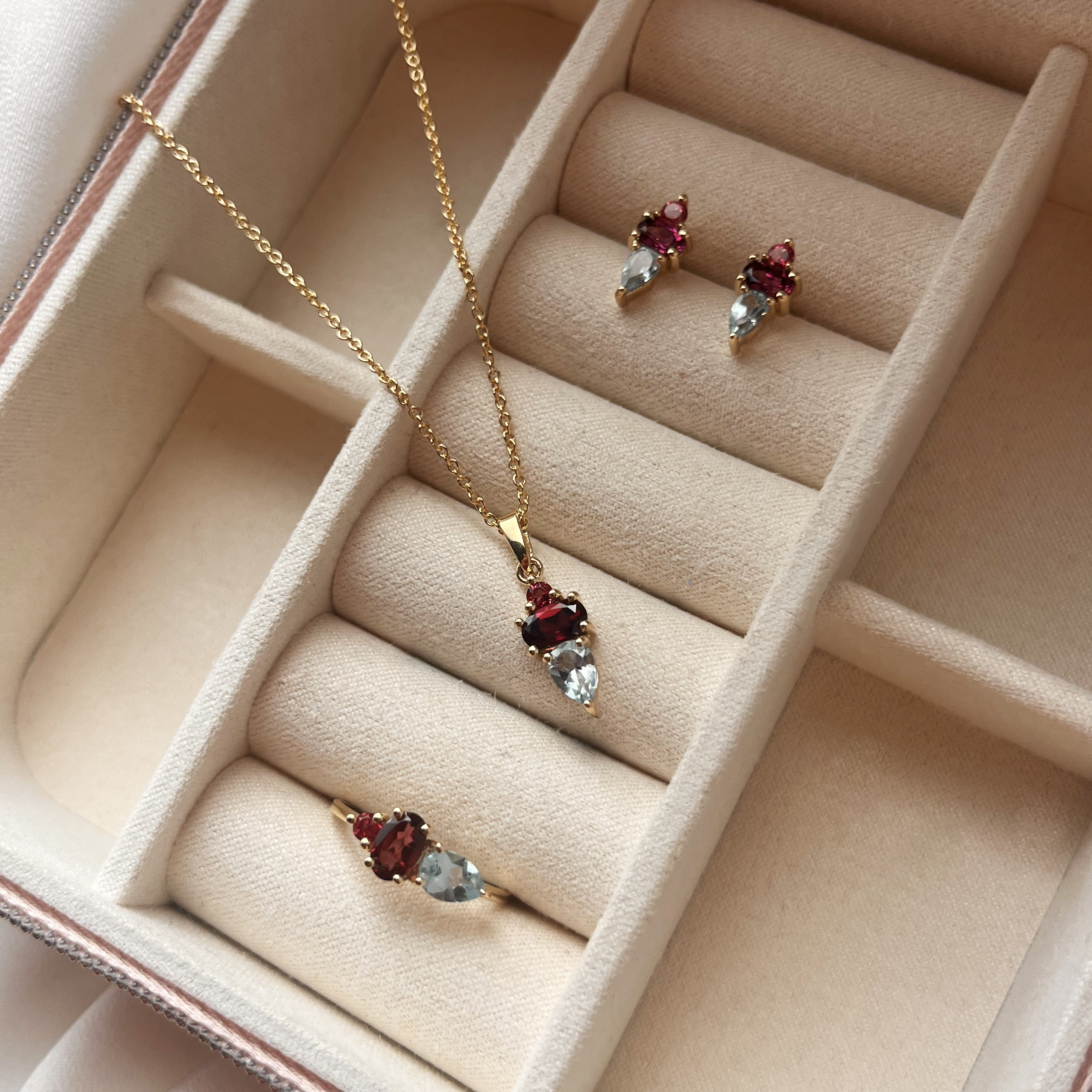 Ring pink/blå topas+rhodolite 8 kt.