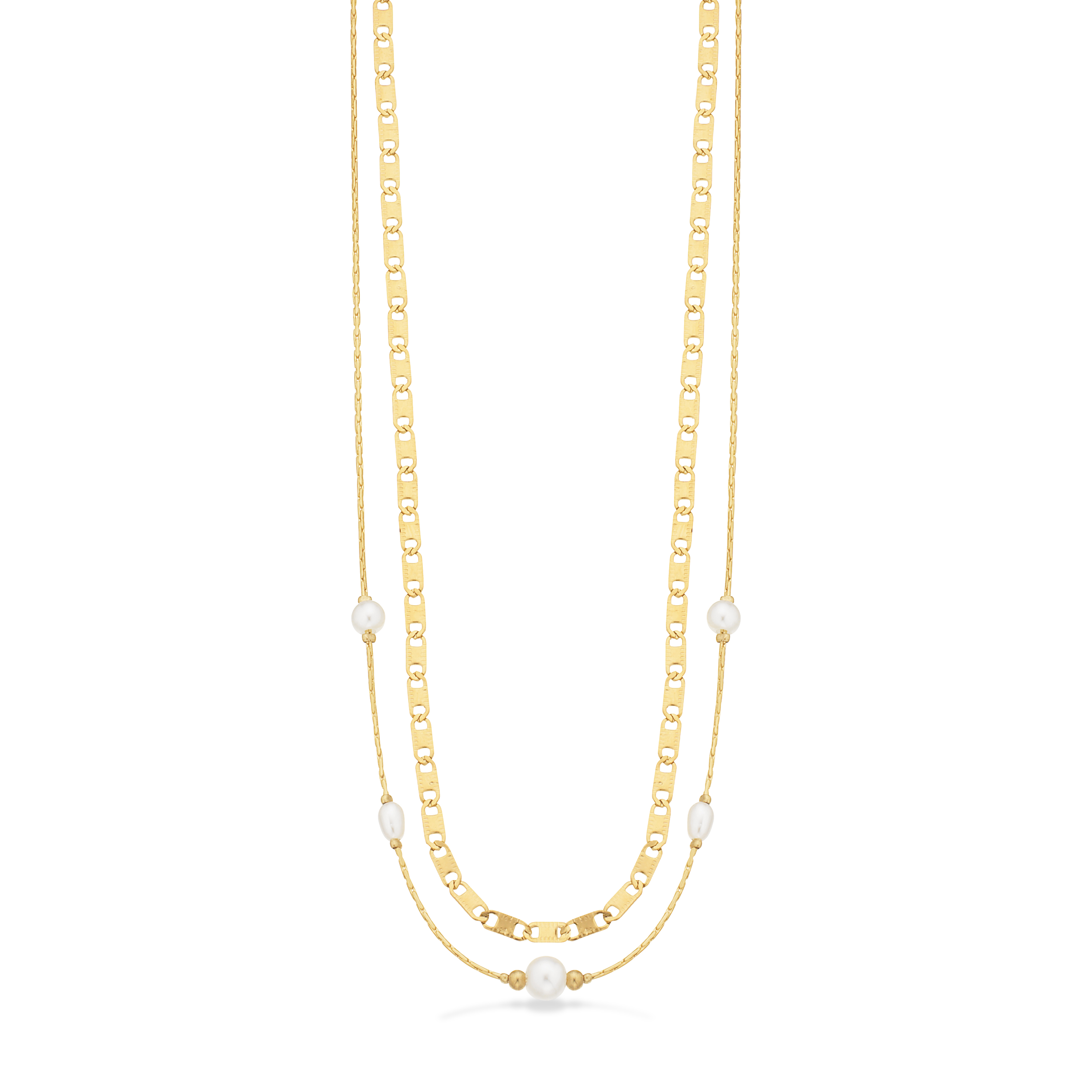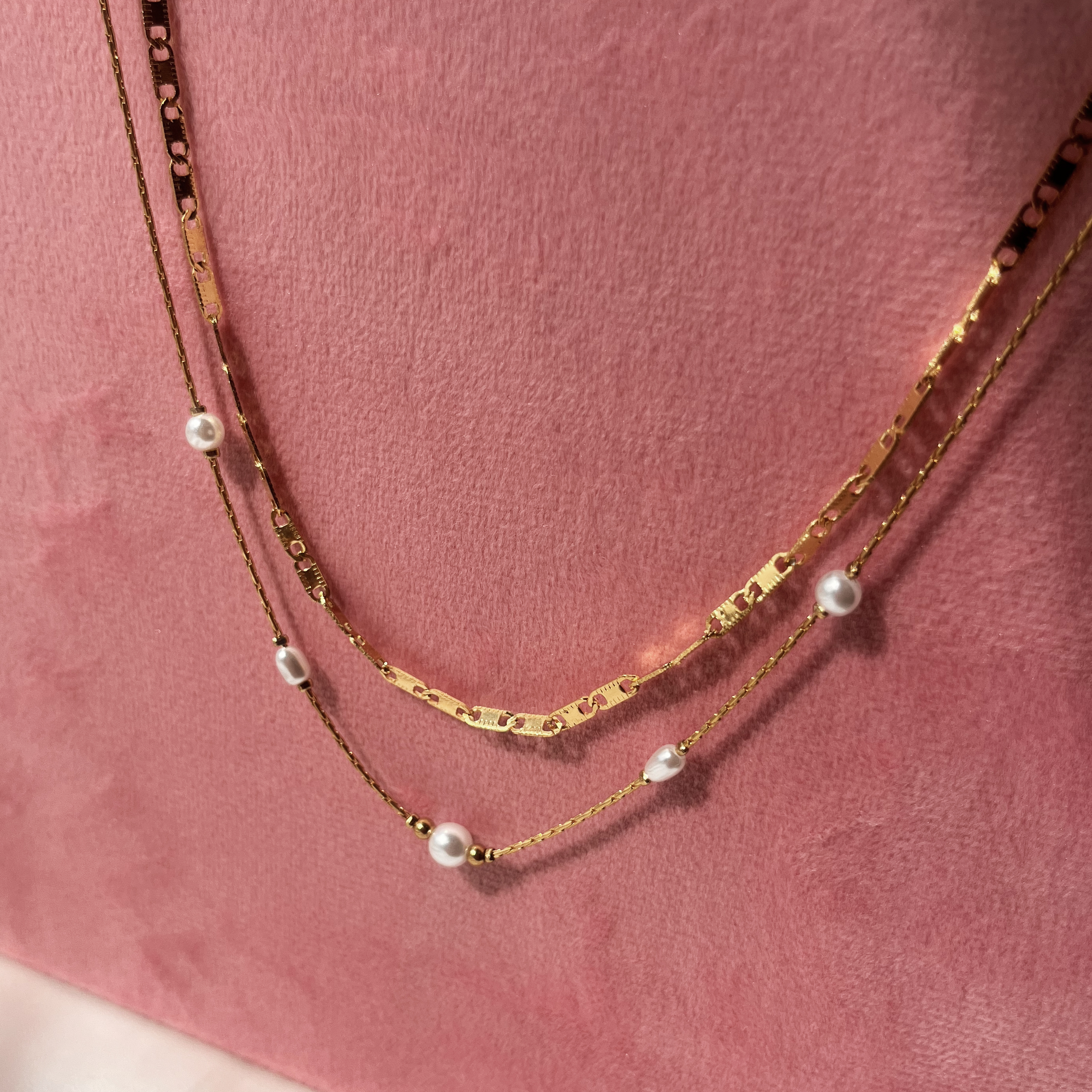 Molly halskæde dbl rk perler stål guldf. 42+3cm